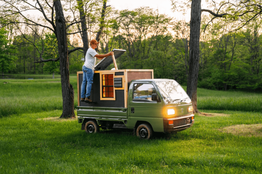 Основанием для постройки стал японский пикап Honda Acty 1998 года. Машину перекрасили из синего в хаки и сменили колёса, но в остальном она осталась почти без изменений. Главное новшество — деревянная надстройка на багажнике, утеплённая пеной и обшитая панелями. Создателю пришлось учитывать грузоподъёмность машины — всего 362 кг.